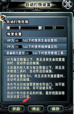 5.到挂机地点 按 CTRL+Y 打开自动打怪界面 点击开启 然后在使用 快捷键 CTRL+3 开启VIP自动捡存功能,最后把仓库和背包界面关闭,即可自动挂机